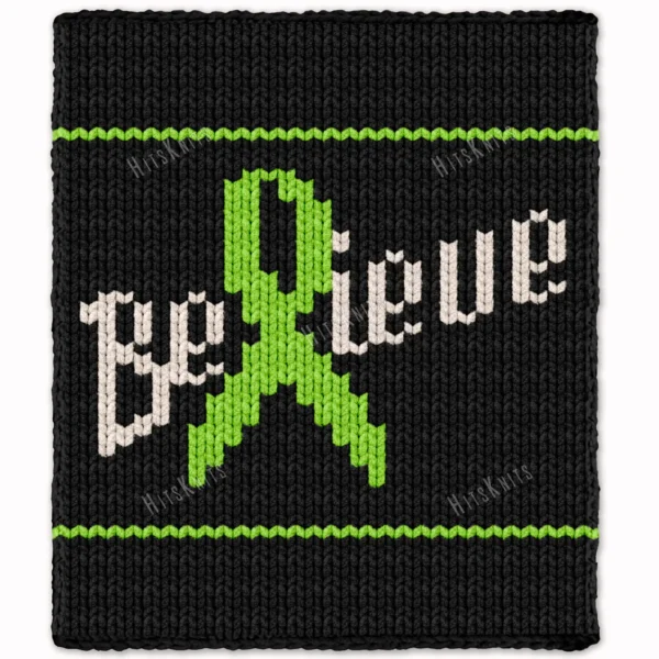Create a meaningful and inspiring handmade blanket with this chunky knit blanket pattern, featuring the word “Believe” with a green awareness ribbon integrated into the design. This motif is closely connected with cancer awareness, symbolizing hope, strength, support, and encouragement for those affected.
