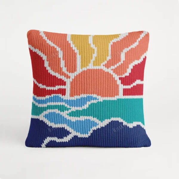 Sunshine knit pillow knitting pattern with colorful intarsia motif. Decorative square cushion cover 35 × 35 cm (14 × 14 in), aran weight yarn, chart and row-by-row instructions included. English PDF pattern, see full description for details.